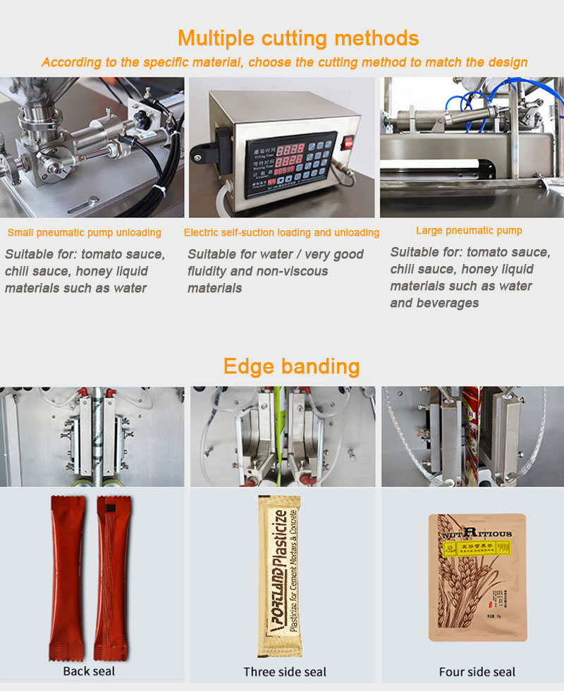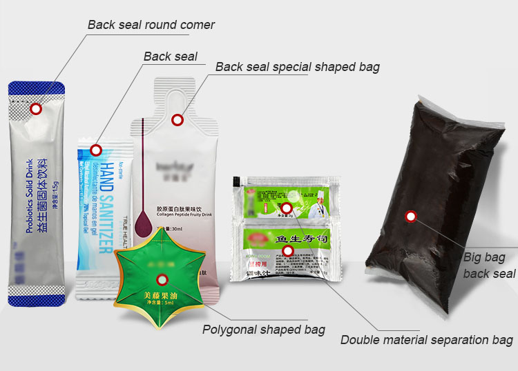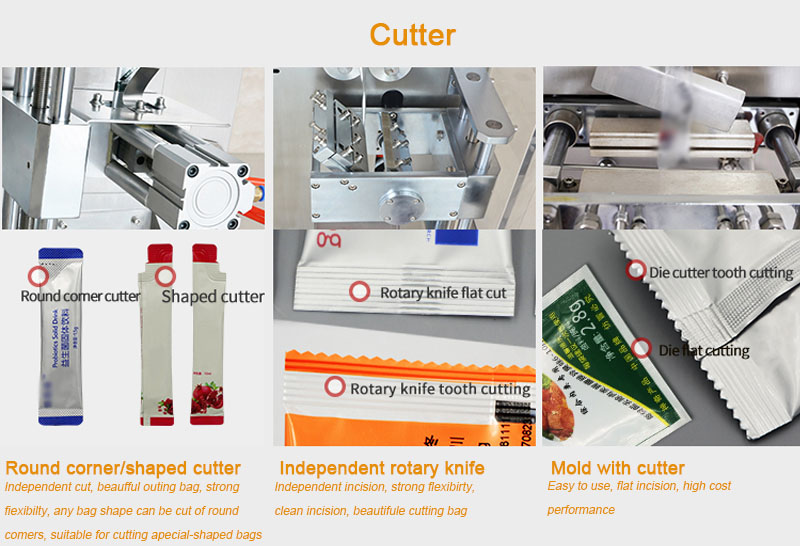 8. With printer (to be able to code the date and batch number) and rotating blade(be able to adjust the length of bag and shape of bag notch edge packing.