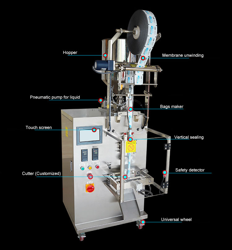 1.Automatic liquid packing machine can finish the process like conveying bag, bag making, filling, weighing, sealing, cutting, counting, lot number, etc.