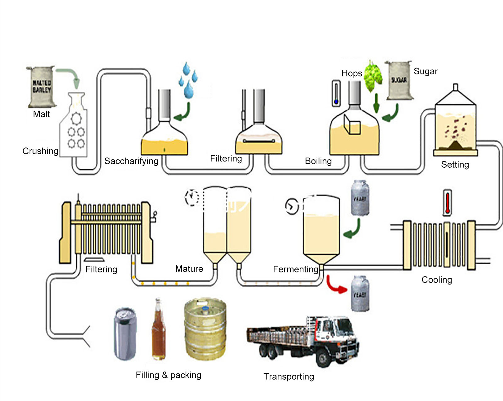 The system contains milling, brewhouse, fermenter, bright beer tank, control unit, Glycol cooling Unit and CIP Cleaning System, as well as kegging and Bottling system.
