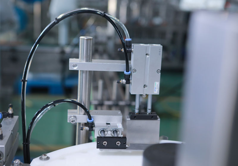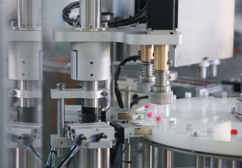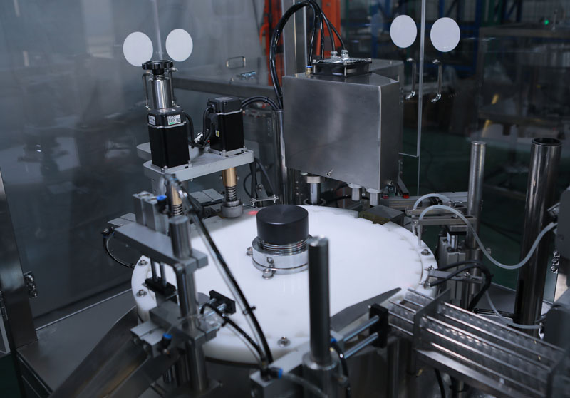 4. Bottle capping process:Vibration plate automatic tube feeding, Vibration plate manipulator grab the upper cover.