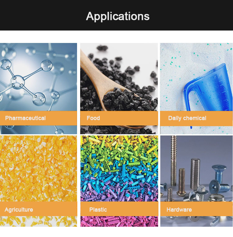 1 .Application: candy, melon seeds, potato chips, pistachio nuts, peanuts, jelly, frozen dumplings, biscuits, chocolate, nuts, pet food, puffed food, small hardware, plastic parts, such as various granular, flaky, strip, irregular shape of the material